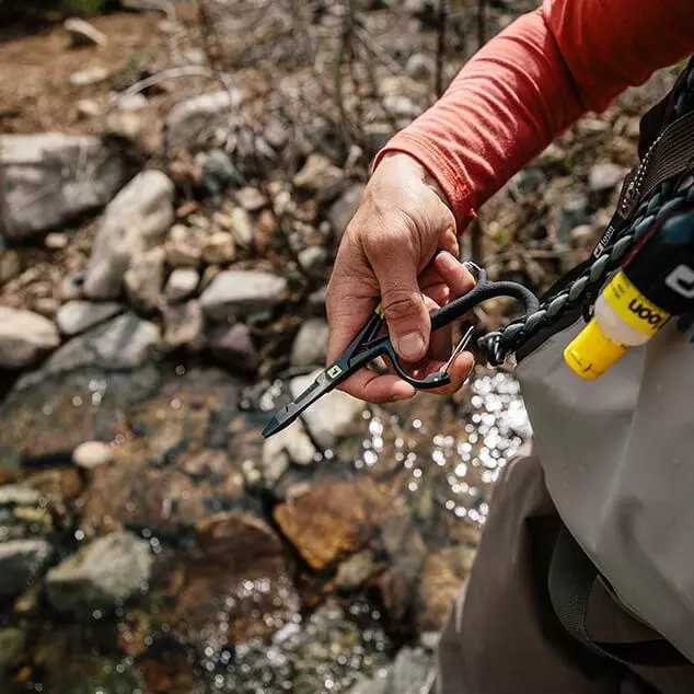 The ultimate mitten clamp, thoughtfully designed from the tips to the jaws to the handle. A carabiner handle means you can store anywhere and the tight angles and engineered shape accommodate all fly sizes, allow for easy hook removal, and can crimp even the heaviest of barbs. Oversized thumb and finger holes accommodate large or gloved hands, and the compact cutting surface easily clips light or heavy leader.