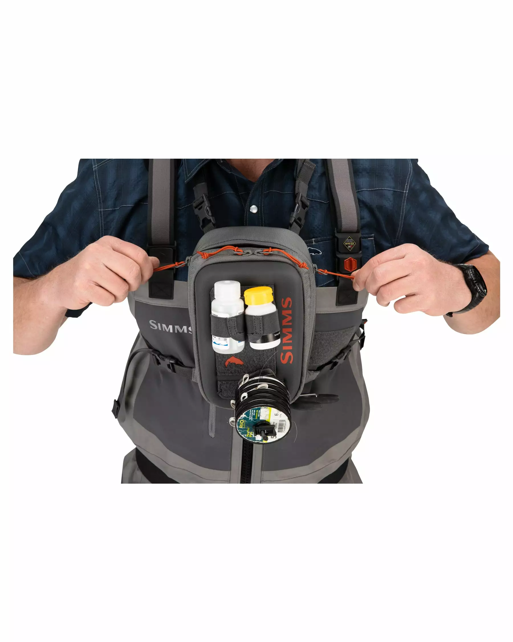 - Accessory attachments include: Tippet Caddy, Floatant Holster, and internal keyclip